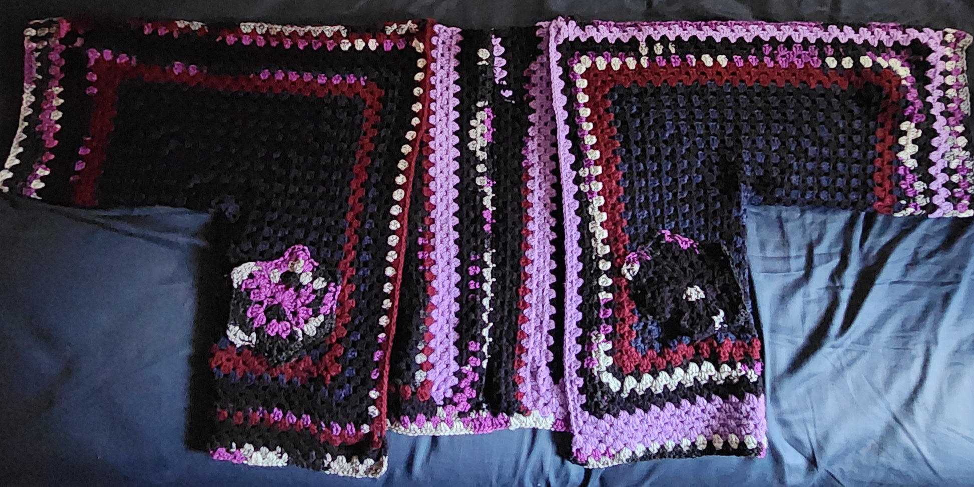 (will take about a month to make) can be made long, short and with or without granny hexagon pockets (can be side or normal pockets) (can also be made with or without the tapered cuffs) its unisex.